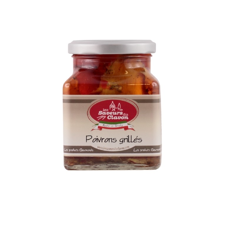 Poivrons grillés tricolores. Ingrédients : Poivrons rouges et jaunes grillés 64%, huile de tournesol, sucre, vinaigre de vin blanc, sel, épices, correcteur d'acidité : acide citrique, antioxydant : acide ascorbique (vitamine C).