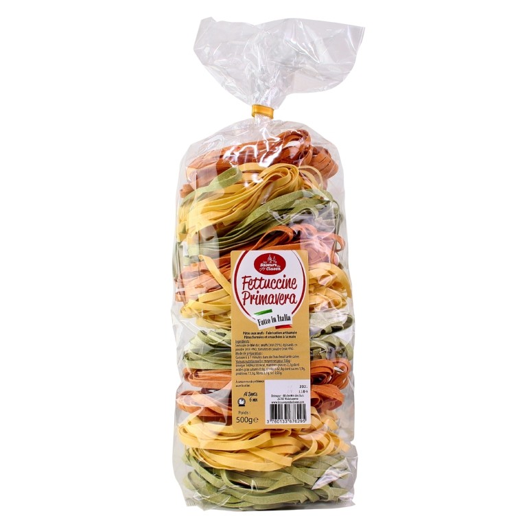 Semoule de blé dur, oeufs (min 20%), tomates en poudre (min 4%), épinards en poudre (min 4%).