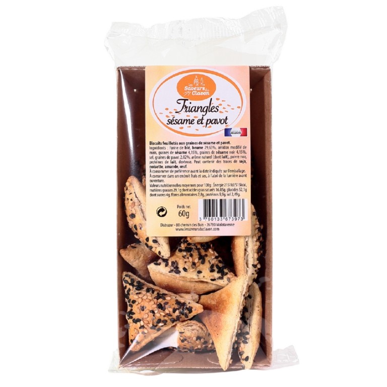 Feuilleté en forme de triangle au sésame, lin et pavot. Encore meilleur si ils sont légèrement réchauffés au four dans la barquette. Ingrédients : farine de blé, beurre 29,63%, amidon modifié de maïs, graines de sésame 4,15%, graines de sésame noir 4,15%, sel, graines de pavot 2,02%, arôme naturel (dont lait), poivre noir, protéines de lait, dextrose. peut contenir des traces de soja, noisette, amande, œufs. - Commentaires
